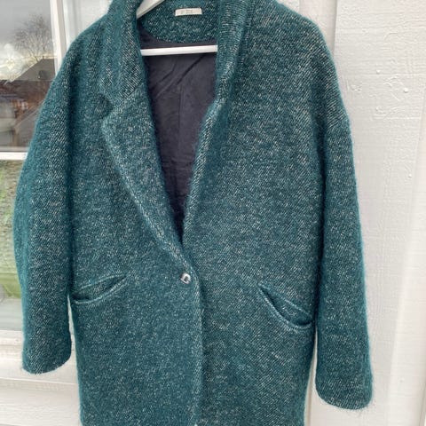 & Other Stories ulljakke for dame i størrelse M. Jakken er grønn og laget i ullmateriale. Den har knytebelte i livet og påsydde lommer foran. Passer som ytterjakke i overgangssesonger eller milde vinterdager.