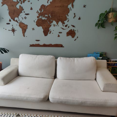 Dansk designsofa, kjøpt på Møbelmiljø Kristiansand for ca 20 år siden, gis bort mot henting. Den er lite brukt de siste 10 år. Den er helt i orden, har gode puter, men stoffet er slitt.