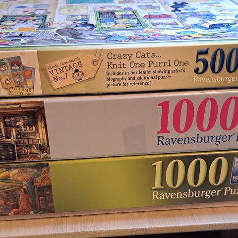 Samling med flere puslespill fra ulike merker.