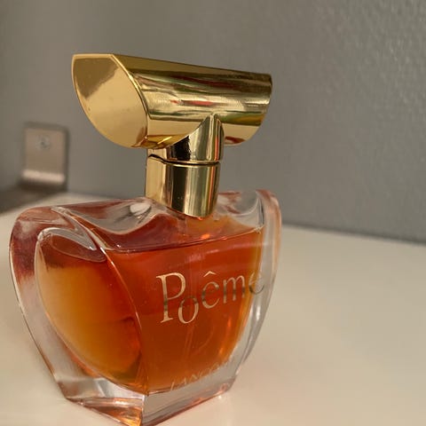 Lancôme Poême parfyme i original flakong. Flasken har en trekantet, skulpturell form med gyllent lokk og ravfarget innhold. Passer som duft til kvinner. 50ml L'eau de parfum
