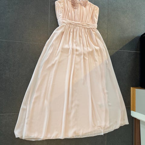 Te Amo stroppeløs kjole i størrelse L. Kjolen er lang og har plissert overdel med dekorative steiner/perler langs bysten. Fargen er dus rosa. Passer som penkjole til for eksempel fest eller formelle anledninger.