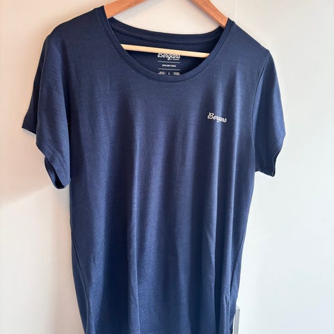 T-skjorten er grå og laget av bomull. Den har rund hals og trykket Bergans-logo med tekst på brystet. Passer til hverdagsbruk og fritidsaktiviteter.