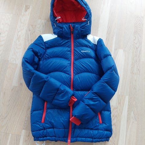 Selger en Craft dunjakke til dame i størrelse L. Klassisk og tidløs modell i rød farge med svarte detaljer. Perfekt som vinterjakke til hverdagsbruk.
