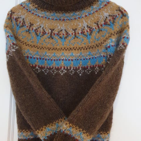 Nydelig genser!! Jeg har selv nettopp kjøpt den, dessverre uten å prøve og størrelsen er feil for meg. Den er pent strikket i Alafosslopi og fremstår som svært lite brukt.