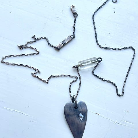 Smykket har en tynn kjede og anheng formet som et anatomisk hjerte. Laget i gullbelagt sølv. Passer som tilbehør til hverdags- og penklær. En moderne klassiker fra Bjørg, det anatomisk korrekte hjertet. Et symbol på ekte kjærlighet og en talisman for hell og lykke. Håndlaget i sølv med inngravering i lenken på latinsk "ab imo pectore" som betyr "Fra bunnen av mitt hjerte". 45cm kjede. Nypris 3900