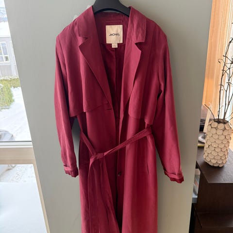 Monki kåpe for dame i blå farge. Kåpen er i one size og laget av polyester. Modellen har dobbeltspent knepping med knapper foran og har sidelommer. Stoffet har en myk overflate, og kåpen har fôr på innsiden. Passer som ytterplagg i overgangssesonger eller milde vinterdager.
