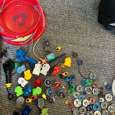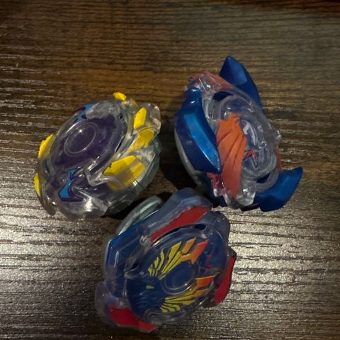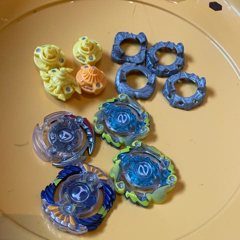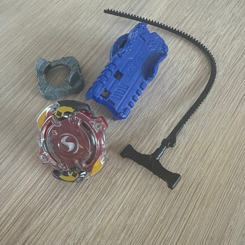 Beyblade Burst-sett bestående av flere toppspinnere i ulike farger og modeller, med tilhørende startmotorer og tilbehør. Settet inkluderer både Beyblade-spinnere og launchere, og passer godt for både barn og samlere. Laget hovedsakelig av plast med enkelte metallkomponenter.