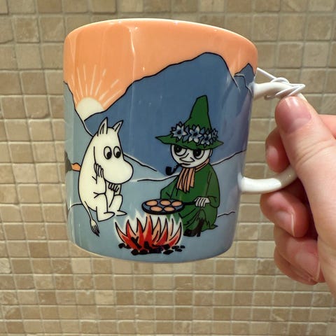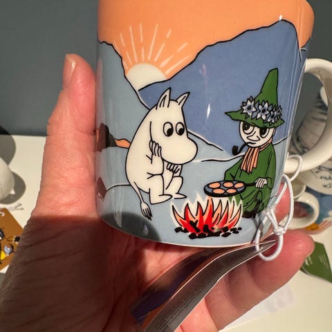 Arabia Mummi kopp med motiv av Mummitrollet og Snusmumrikken ved leirbål. Kopp i keramikk/steingods med hank. Passer til servering av varme og kalde drikker ved frokostbordet, på kjøkkenet eller som samleobjekt for Mummi-serien fra Arabia.