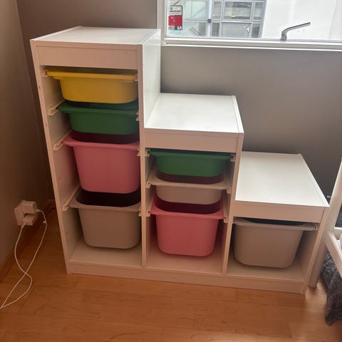 IKEA oppbevaringssystem for barn med plastkasser hvit