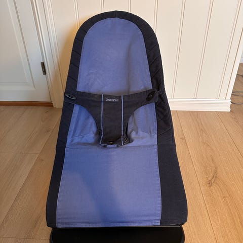 Babybjörn barnestol. Klassisk vippestol med tekstilsete i mørk farge og lekebøyle foran. Egnet for små barn som trenger støtte til å sitte og hvile. Stofftrekket kan tas av for rengjøring. Stabil ramme med enkel konstruksjon som kan brukes både til lek og hvile for barnet.