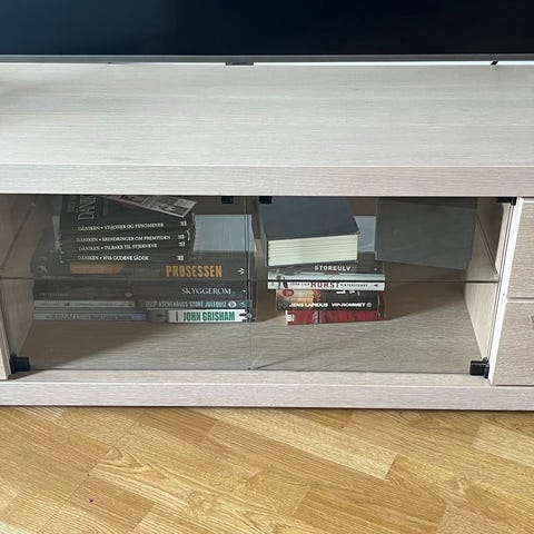 Tv benk i hvit glans med matt grå skuffer veldig fin. Selges 500 eller bud