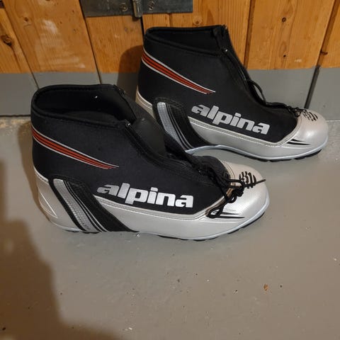 Alpina Sport langrennsstøvler i størrelse 44. Modellen er laget for klassisk langrenn. Støvlene har snøring med røde lisser og glidelås.