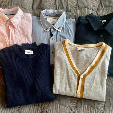 Pakke med barneklær til gutt i størrelse 122. Inneholder flere plagg fra blant annet Hummel, inkludert hettegensere og langermede gensere, samt ulike t-skjorter og en shorts. Klærne har varierte farger og trykk, egnet til hverdagsbruk for gutt i ca. størrelse 122.
