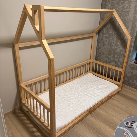 Hus-design: Denne småbarnssengen er smart designet med en ramme i husstil der du kan henge opp sengegardiner for å skape privatliv for barnet ditt.