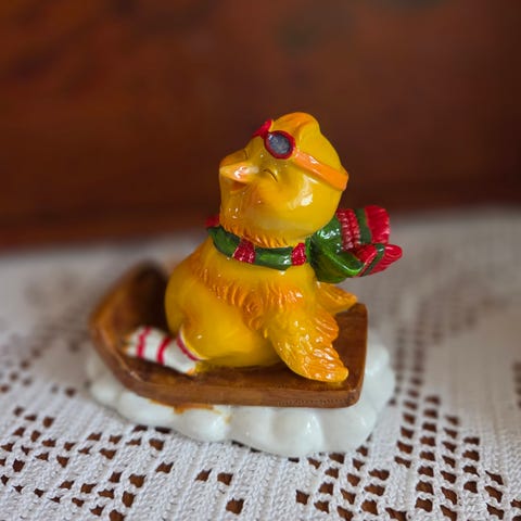 Måler H 10 cm og L 18,5 cm. Plass til telys som indikerer bålet kyllingene varmer seg på.