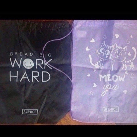 Kiabi ryggsekk med svart og hvitt teksttrykk. Egnet for daglig bruk og oppbevaring av personlige eiendeler.