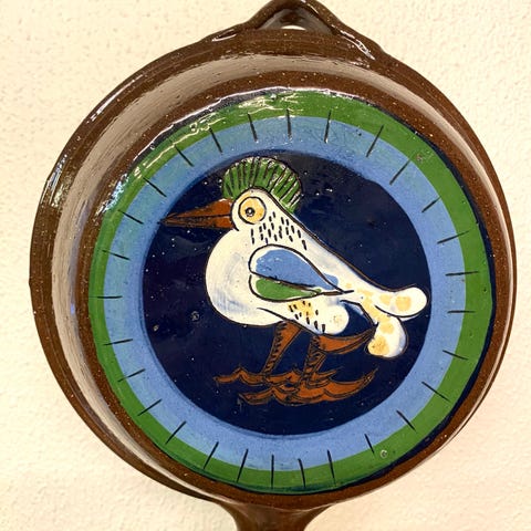 Kjempefin keramikkpanne med hane-dekor fra Rolf Hansen. Hansen (1922-2004) var kjent for sin frodige og dekorerende stil. Han drev Kongsberg keramikk fra 1947-57 sammen med Birgitte Carlsen og Svein Skjæveland og kona Ragna Fusche Hansen. Han var en av norges fremste keramikere. Panna er et eksempel på hans karakteristiske stil med chamotte (grov leire) og glinsende glasurer. Flotte blåfarger, ellers rødbrunt, brunt og grått.
