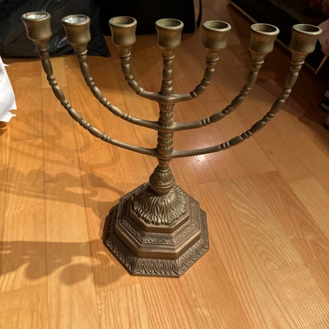 Dette er en tung, solid og svært dekorativ vintage-modell med et klassisk menorah-inspirert uttrykk, rikt detaljarbeid og vakker, naturlig patina som gir karakter og autentisitet. Et virkelig statement-objekt som fungerer like godt som kunst, interiørdetalj eller samlergjenstand.