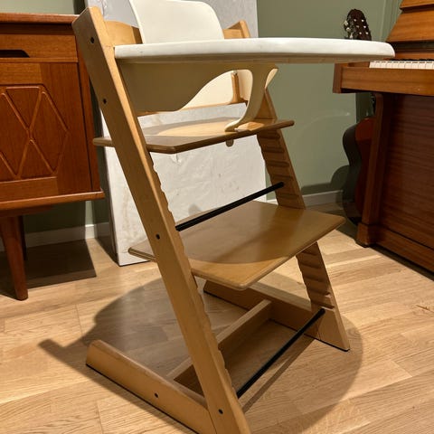 Veldig fin, stabil og komfortabel matstol til lille venner i godt som ny stand. Laget av glatt gummitre. Brukt av og på i omtrent ett år. Vår lille 2-åring foretrekker nå å sitte på fanget eller i vanlig voksenstol, dette er grunnen vi selger den. Stolen leveres ferdig pakket i originalemballasjen fra produsenten med alle deler (uskadet).