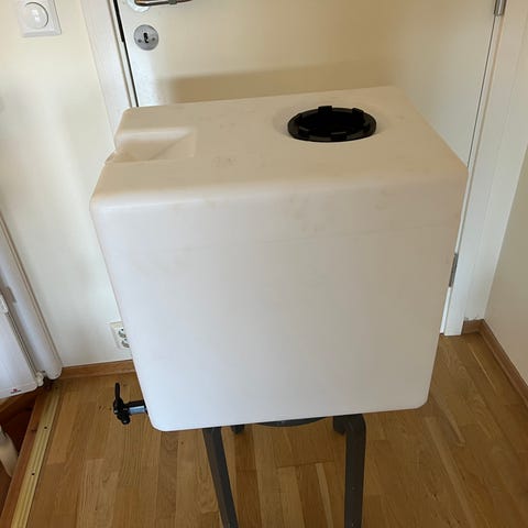 Vannbeholder 100 l i plast med tappekran. Beholderen er laget i hvit plast med skrulokk på toppen og tappekran i bunnen. Den har stort påfyllingslokk for enkel rengjøring og håndtak for lettere håndtering. Lite hull for rørgjennomføring om pumpe tilkobles.