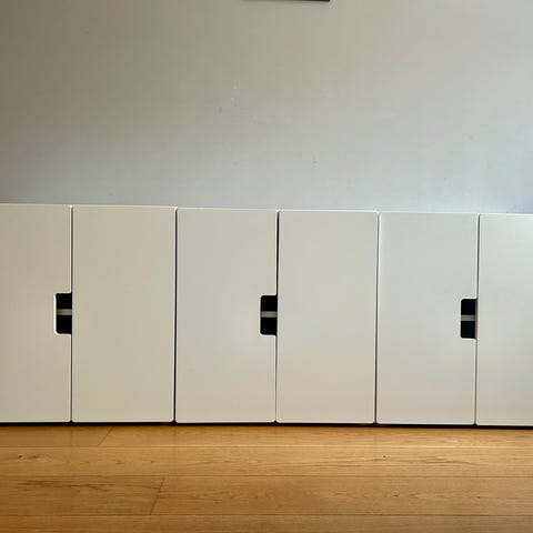 IKEA hyllekombinasjon med hvit stamme og dører treutførelse. Øvre del består av åpne hyller med justerbare hylleplater, egnet til bøker, leker eller annet utstyr. Nedre del er dypere og har skap med dører og innvendige hyller for skjult oppbevaring.