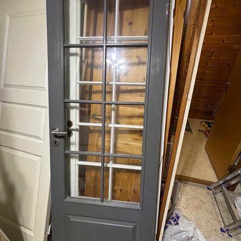 Ser tilsvarende dører med glassruter selges for 5000-9000 kr når de er nye.