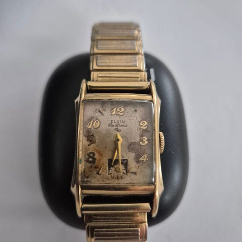Gammel Mita tank fra dødsboet til en urmaker. Klokken har urverk fra Eterna og tikker når jeg trekker den opp. Som synlig på bildene så mangler en del av glasset.
