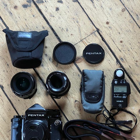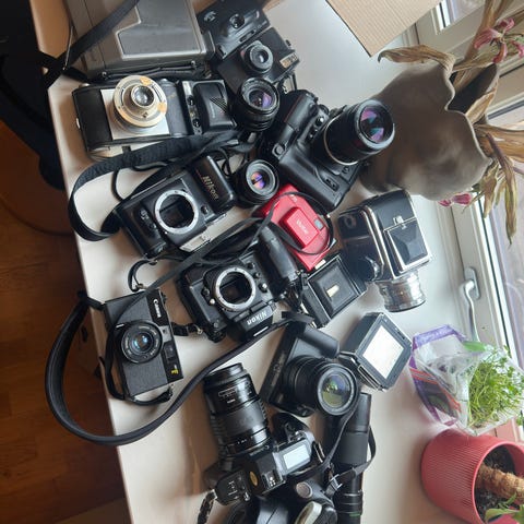 Nikon og Canon analoge speilreflekskamera. Beaulieu Super 8. objektiver, teleconvertere. Varierende tilstand, det meste fungerer som det skal, men ingen garanti. «Dumpes» til 5000,- til første som melder seg. Kom gjerne og se på det.
