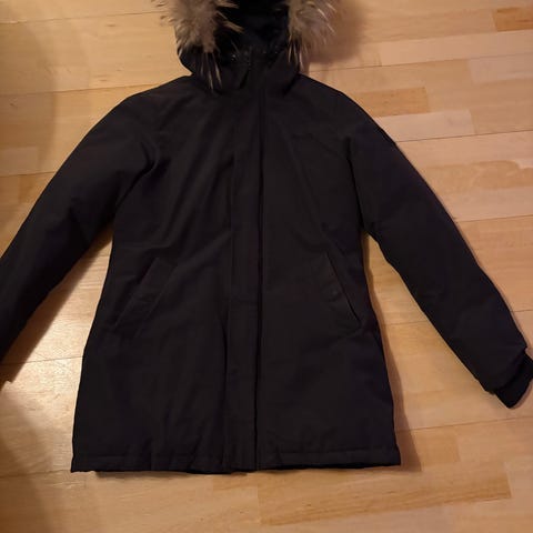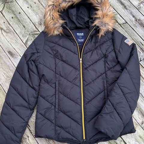 Svea vinterjakke for dame i størrelse XL. Jakken er mørk blå. Den har hette med avtagbar pelskant (ukjent om ekte eller fuskepels), glidelås i kontrastfarge foran og vattert, v-formet quiltet mønster. Egnet som ytterjakke i kjølige sesonger.