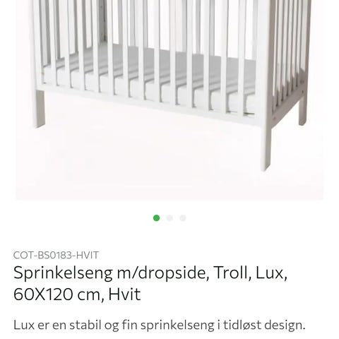 Troll sprinkelseng lux med dropside. Få bruksmerker (se bilde) og Helsemadrass kan følge med hvis ønskelig. Ferdig demontert og kan hentes på Årvoll.