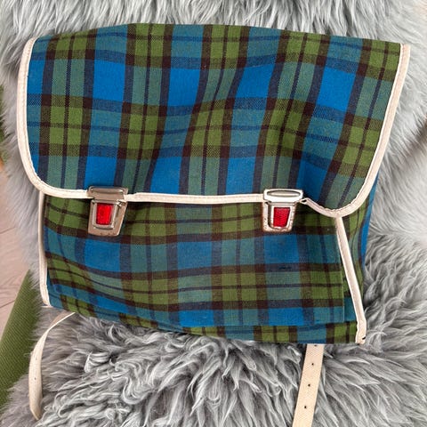 Stilig skolesekk fra 70-tallet. Se bilder for bruksmerker. Har for mange vesker, så i et fosøk på minimalisme, selges deler av retro-samlingen.