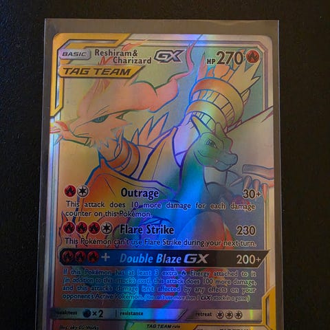 Pokémon Reshiram & Charizard GX Tag Team samlekort. Kortet viser Reshiram og Charizard i GX Tag Team-versjon med angrepene Outrage, Flare Strike og Double Blaze GX. Kortet har HP 270 og er en del av Pokémon Trading Card Game. Egner seg til samling eller spill i Pokémon TCG-formatet.