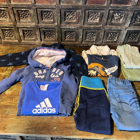 Pakken inneholder 8 plagg. Veldig fint pentøy med skjorte og bukse fra Name It, 1 fleecejakke, 1 spiderman genser, 1 hettegenser, 1 skjorte, 1 pysj, 1 lue. Noe til hverdags og noe til fest.