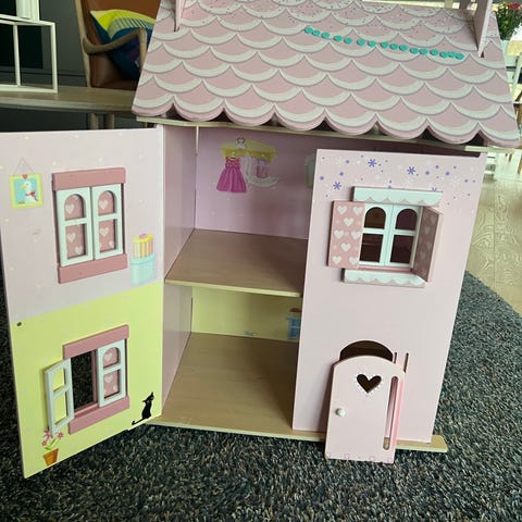 Kom og het dukkehus. Plass til barbie, men kan brukes til andre også. Noen mangler som trolig er lette å fikse med lim..