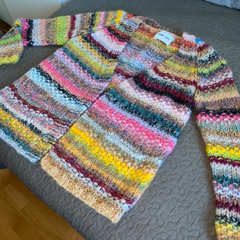 Nydelig, håndstrikket cardigan i vakker boblestrikk fra Dawn × Dare. Cardiganen er laget i en myk mohairblanding. Jakken er kort, har en avslappet passform og lange ermer. Alle strikkeplagg fra Dawn x Dare er håndstrikket av lokale italienske damer som jobber hjemmefra i små landsbyer noen få timer utenfor Roma. Hvert plagg er derfor unikt! Materiale: 40% kid mohair, 30% akryl, 30% polyamid.