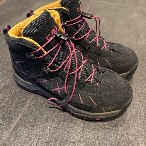 CMP tursko for barn, modell 3Q09660, i størrelse 37. Skoene er i svart med rosa detaljer og lisser, og har middels høyt skaft som gir støtte rundt ankelen. Overdelen er i tekstil og syntetisk materiale, med polstret innside i rosa tekstil for økt komfort. Yttersålen er grovmønstret for bedre grep på ulike underlag. Passer til jente og er egnet til tur, fritid og hverdagsbruk utendørs.