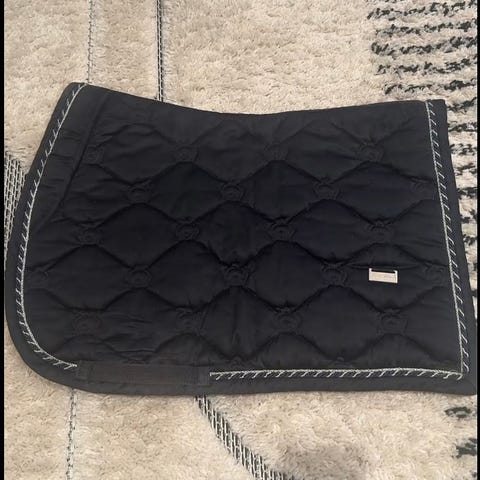 PS of Sweden sjabrak i blå farge. Kraftig, vattert stoff med rutet quilting og dekorativ kant. Undersiden er i mørkt, strukturert materiale. Utstyrt med stropper for feste til sal. Egnet som allround/sprang sjabrak til ponni i daglig trening eller konkurranse. Nydelig blåfarge! Ble for liten for vår kraftige 1'er ponni....sprang