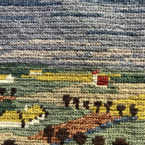 norsk - veggteppe - ullbroderi - håndbrodert - håndarbeid - håndlaget - husflid - naturmaterial - vintage - retro - modern - blå - oransje - grønn - vårlig - sommerlig - fugl - tiur