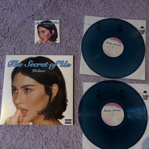 Special edition Deluxe-utgave av Olivia Rodrigo sitt album Guts på clear vinyl med lilla og rød splatter-effekt. Skriver godt brukt siden den har noen små skader på cover, men selve vinylen er helt fin.