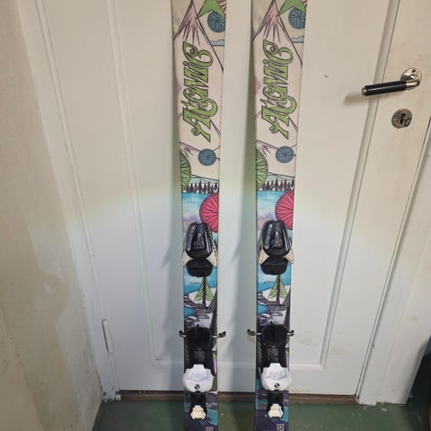 K2 alpinski med lengde 136 cm. Skiene har binding som kan justeres mer enn normalt. Demobinding. Skiene har fargerikt mønster på oversiden og hvit såle. Montert med Marker-bindinger, justerbare for ulike støvlelengder. Egnet til park og bakke.