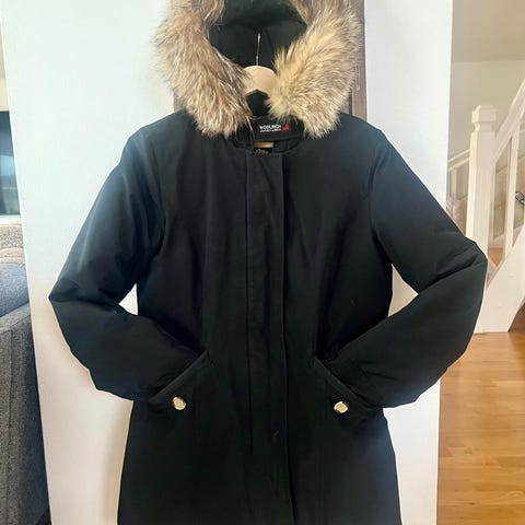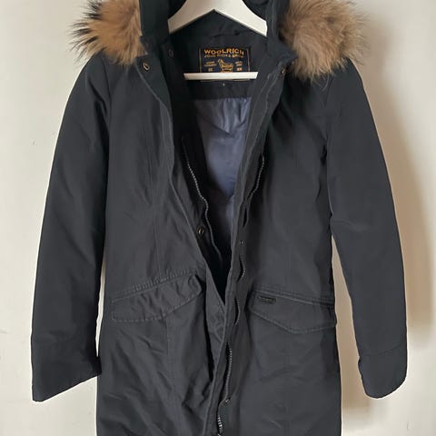 Jakken er svart og fylt med dun, noe som gir god isolasjon på ekstra kalde dager.