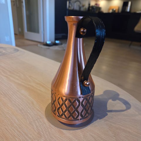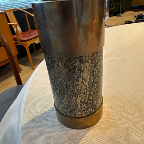 Gammelt paraplystativ i kobber. Bærer preg av at det har stått på loftet en stund. Har fått grønne «irringer» på enkelte steder. Har tatt bilder av alle «sider», også under