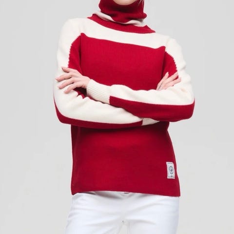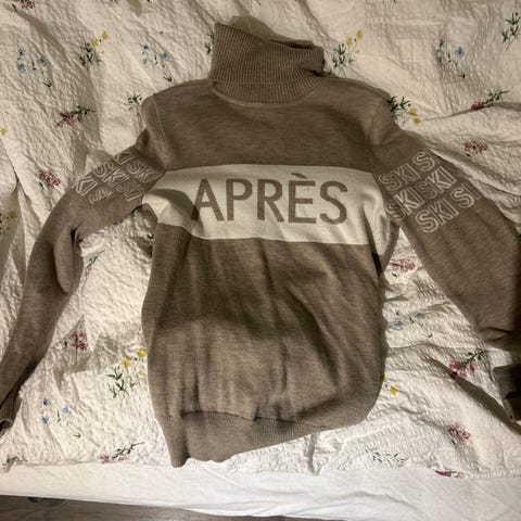Famme høyhalset genser for dame i størrelse L. Genseren er hvit med sorte kontrastfelt, store stjerner på ermene og teksten «SKI» foran. Laget i merinoull, med tettsittende passform og høy hals som dekker godt rundt nakke og hals. Egner seg til bruk både til hverdags og som mellomlag på kjølige dager.