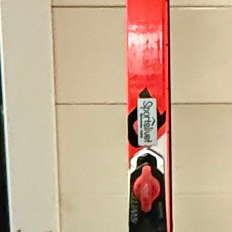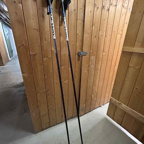 En liten skramme på den ene skien som vist i bildet, ellers i god stand.