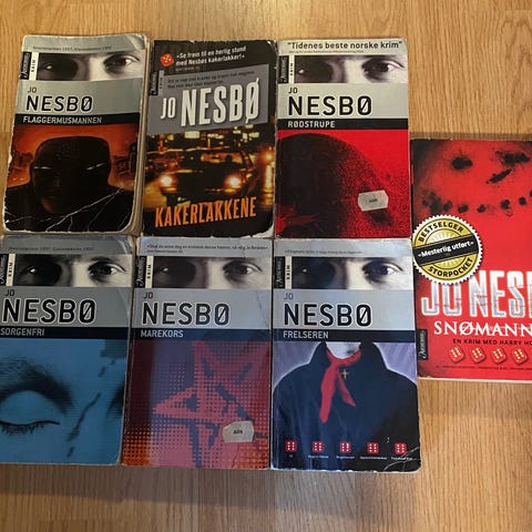 Jo Nesbø Harry Hole krimbøker, sett med 4 innbundne bøker. Pakken inneholder titlene «Politi», «Gjenferd», «Tørst» og «Kniv». Alle bøkene er i hardback/innbundet utgave med originale omslag. Sjanger: krim/thriller. Språk: norsk.