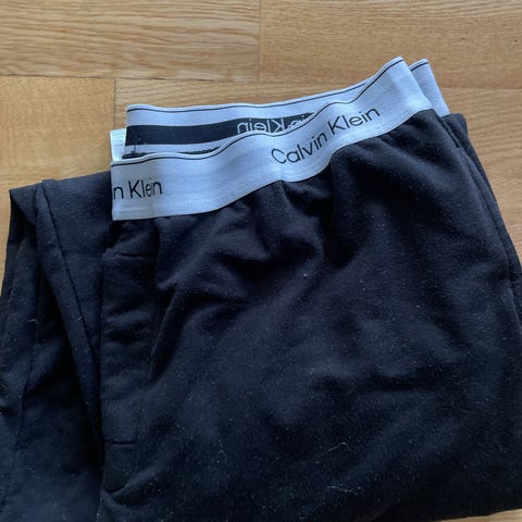 Calvin Klein tights for dame i størrelse S. Tightsen er svart og har elastisk linning med Calvin Klein-logo. Materialet består hovedsakelig av bomull med innslag av andre fibre for stretch og komfort.
