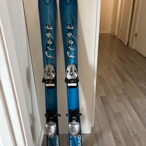 Head Frost alpinski i lengde 137 cm. Skiene har twintip-design og markert bred tupp, egnet til alpinkjøring og lek i bakken. Overflaten har lilla og hvite detaljer med grafisk motiv. Undersiden er sort. På bildene følger det også med en lilla Frost-hjelm.