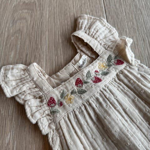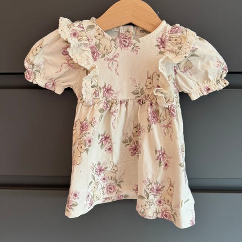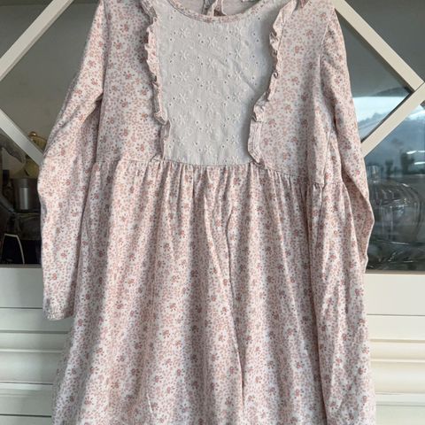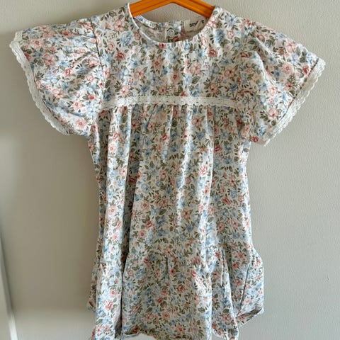 Pent brukt kjole fra newbie str 92. Hvit med mønster av blomster og blonde kant.