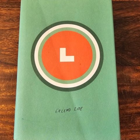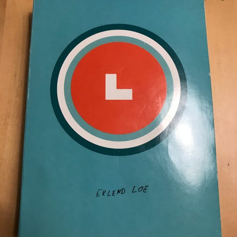 Erlend Loe L roman i innbundet utgave. Boken har svart hard perm med smussomslag i grønn og rød design. Utgitt av Bokklubben Nye Bøker. Norsk språk. Passer for lesere som ønsker en norsk samtidsroman i innbundet format.