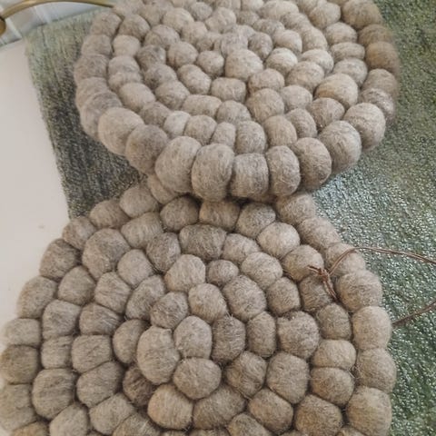 Hemtex gryteunderlag i ullkuler. Rundt gryteunderlag i naturfarger (grå, beige og offwhite) med opphengsløkke, samt et mindre, kvadratisk gryteunderlag i lilla ull. Begge er laget av tovede ullkuler som gir god isolasjon mot varme overflater. Egnet til bruk under gryter, kjeler og varme serveringsfat på kjøkken og spisebord.